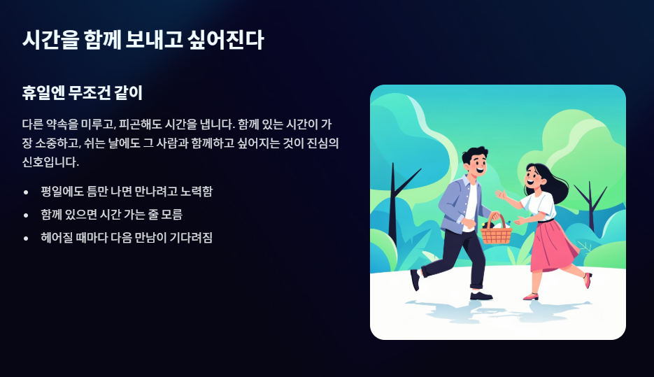 - 결정적인 한 마디 (고백의 타이밍): 5번(휴일에 같이 있음)처럼 분위기 좋은 날, 장난스럽게라도 **"우리 진짜 연인 같네?"**라고 툭 던져보세요. 상대방의 반응을 통해 확신을 얻을 수 있습니다.