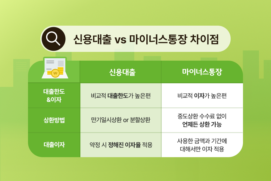 | 비교 항목 | 💳 마이너스통장 | 💰 신용대출 |