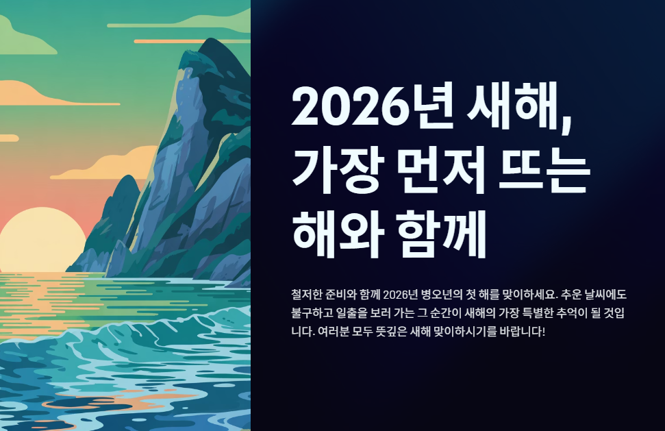 - 교통편 확인: 정동진이나 간절곶 등 유명 명소는 당일 새벽 교통 혼잡이 매우 심합니다. 대중교통이나 셔틀버스를 미리 확인하세요.