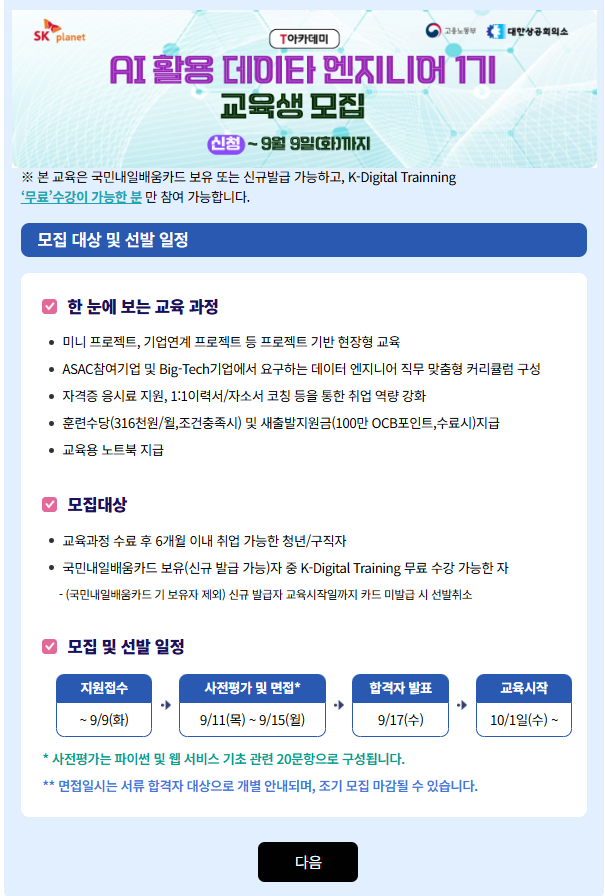 T아카데미 ASAC AI활용 데이터 엔지니어 1기 교육생 모집