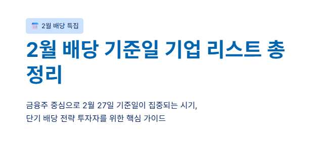 특히 금융주 중심으로 2월 27일 기준일이 몰려 있어 단기 배당 전략 투자자들이 가장 많이 검색하는 시기입니다.