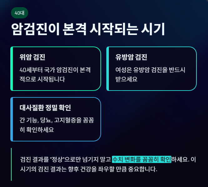 40세부터는 국가 암검진이 본격적으로 시작됩니다. 이 시기의 검진 결과는 향후 건강을 좌우할 만큼 중요합니다.