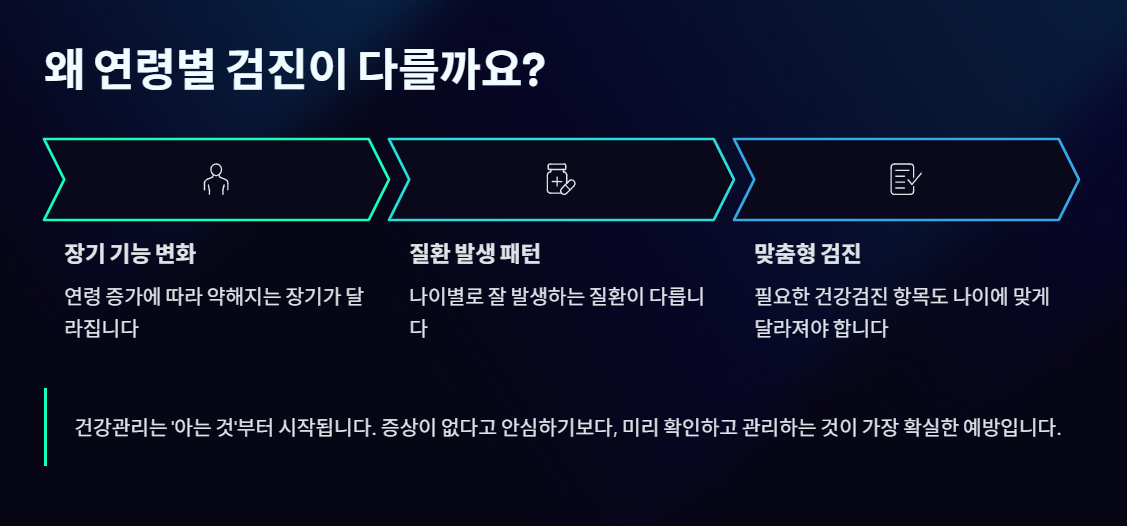 연령이 증가함에 따라 약해지는 장기와 잘 발생하는 질환이 달라집니다. 그에 따라 필요한 건강검진 항목도 나이에 맞게 달라져야 합니다. 건강관리는 ‘아는 것’부터 시작됩니다. 증상이 없다고 안심하기보다, 미리 확인하고 관리하는 것이 가장 확실한 예방입니다.
