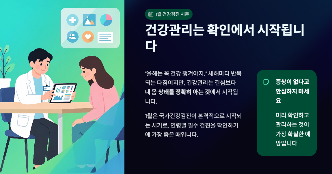 2026년 새해 건강 계획, 막연한 결심보다 지금 내 나이에 필요한 건강검진부터 확인해보세요. 건강은 결심이 아니라 확인에서 시작됩니다. 올해는 검진 결과를 기준으로, 현실적인 건강 관리 계획을 세워보시기 바랍니다.