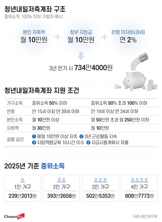 - B씨 (3인 가구, 소득 230만원): 본인 월 10만원 저축 + 정부 30만원 지원 → 3년 뒤 약 1,512만원 수령