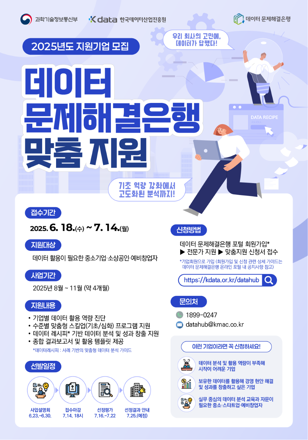 한국데이터산업진흥원은 2025년 6월 18일부터 7월 14일까지 중소기업, 소상공인, 예비창업자를 대상으로 「데이터 문제해결은행 맞춤 지원」사업 참여기업을 모집한다. 본 사업은 기업별 데이터 활용역량 진단, 맞춤형 스킬업, 데이터 분석·활용, 종합 결과보고서 제공 등 데이터 기반 자생력 강화를 지원한다. 신청은 데이터 문제해결은행 온라인 포털에서 가능하며, 사업기간은 8월부터 11월까지다[2][3][4]。