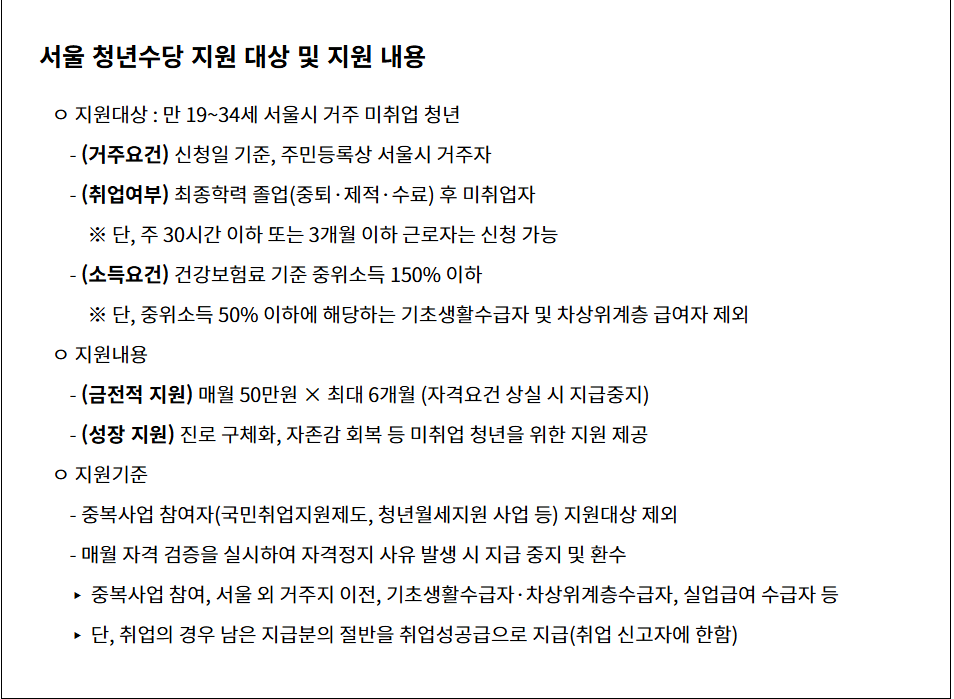 서울시 거주 미취업 청년에게 매월 50만 원씩 최대 6개월간 지원금을 지급하고,