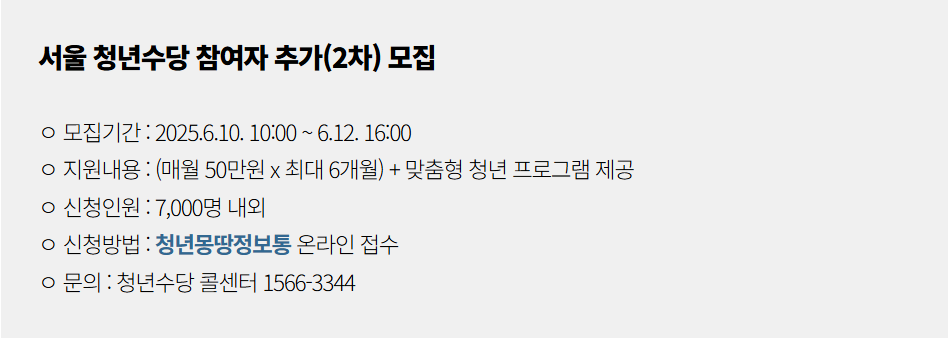 | 2025년 서울시 희망두배 청년통장 신청 방법·조건·장점 총정리 2년 만에 720만 원, 3년 만에 1,080만 원 목돈 만들기 (0) | 2025.06.10 |