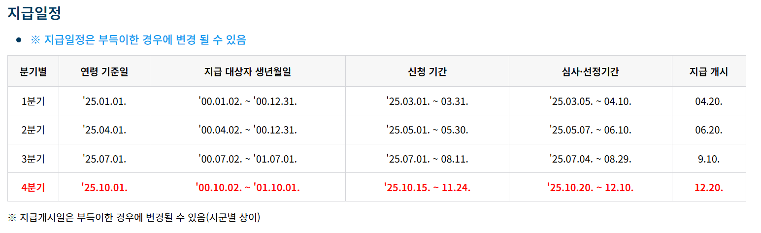연령은 주민등록상 생년월일 기준이며, 2025년 1분기 지급 대상자는 2001년 1~3월 출생자입니다.