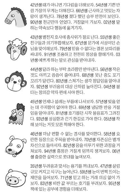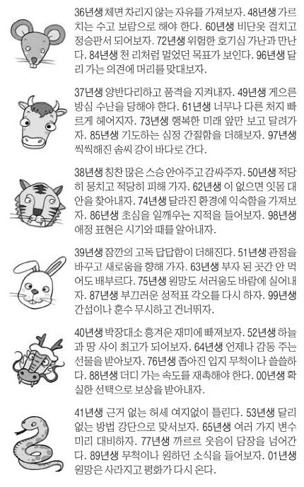 | 쥐띠 | 인내가 필요한 하루. 힘만 들고 소망 성취는 어렵다. | 조급해하지 말고, 인내심을 갖고 하루를 보내세요. |