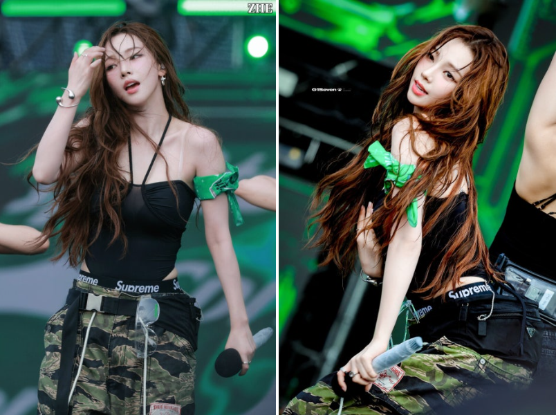 - 패션: 블랙 홀터넥 바디수트, 데님 숏팬츠, 내추럴 웨이브 헤어, 무대 후에는 흰 나시로 반전 매력