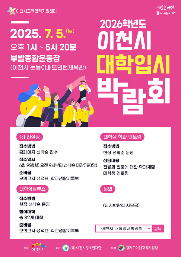 2026학년도 이천시 대학입시 박람회가 2025년 7월 5일(토) 오후 1시~5시 20분, 이천시 눈높이배드민턴체육관(부발종합운동장)에서 개최됩니다. 전국 주요 대학 33곳이 참가해 입학 전략, 학과 정보, 최신 입시 트렌드를 제공하며, 1:1 대입 컨설팅과 대학생 멘토 상담 등 실전 맞춤형 진학 지원이 준비되어 있습니다. 사전신청은 공식 누리집에서 선착순 180명까지 가능하며, 현장 신청도 일부 운영됩니다[1][2][4][7][8][11][12].