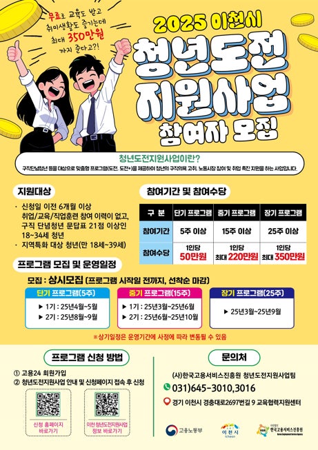 2025년 이천시 청년도전 지원사업은 최근 6개월 이상 취업·교육·훈련 이력이 없는 만 18~34세 구직단념청년, 자립준비청년, 복지시설 입·퇴소 청년, 북한이탈 청년 등을 대상으로 맞춤형 취업역량 강화 프로그램을 제공합니다. 고용24 홈페이지 또는 운영기관 방문으로 신청 가능하며, 프로그램 이수 시 최대 350만원까지 지원금을 받을 수 있습니다[1][3][4][5][6].