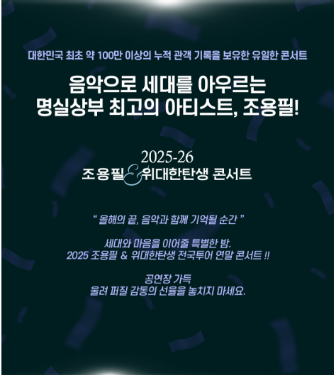 🎤 2025-26 조용필 & 위대한 탄생 전국투어 콘서트 정보 총정리“가왕과 팬이 다시 만난다. 전국이 무대다.”2025년 말부터 2026년 초까지, 조용필 & 위대한 탄생 투어가 부산, 대구, 인천, 광주를 순