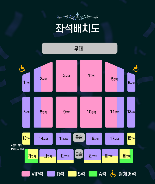 좌석은 총 6개 구역으로 구성되며, 전석 지정석입니다.