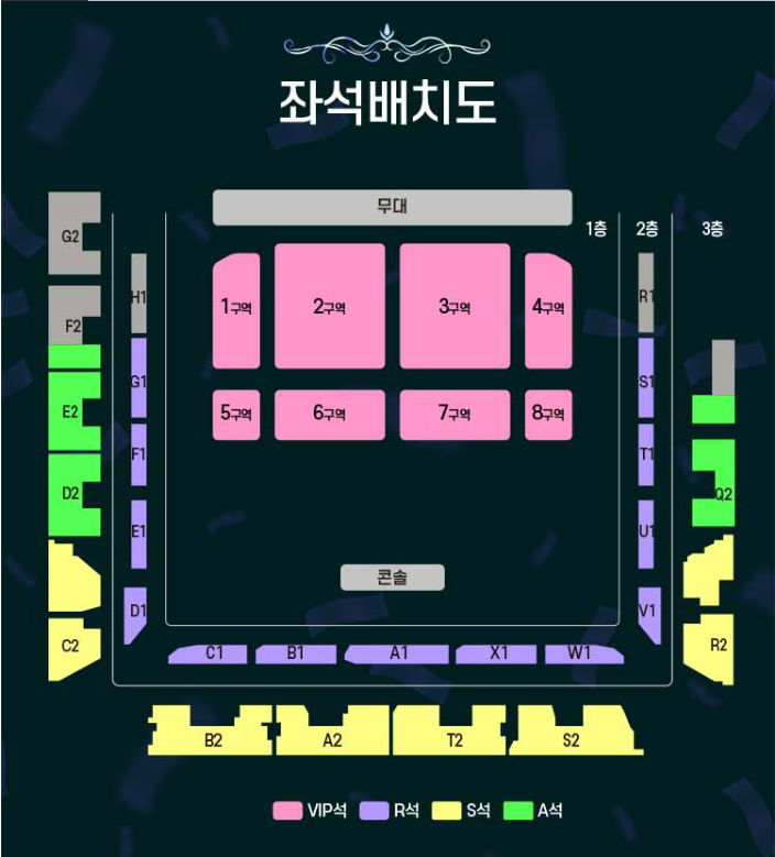 VIP석은 중앙 전면, R석은 좌우 대각 시야, S석과 A석은 후면 및 2층 관람석입니다.