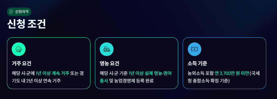 • 해당 시·군에 주소를 두고 실제 거주·영농 중인 경우 신청 가능