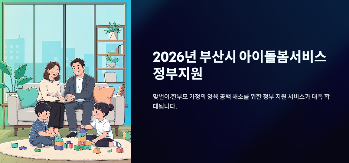 맞벌이 가정, 한부모 가정 등으로 인해 양육 공백이 발생하는 가구를 지원하기 위해 2026년 부산시 아이돌봄서비스 정부지원 제도가 확대 시행됩니다. 이번 개편의 핵심은 정부지원 소득 기준 상향으로, 더 많은 가정이 아이돌봄서비스 혜택을 받을 수 있게 되었다는 점입니다. 본 글에서는 2026년 부산시 아이돌봄서비스 정부지원 신청방법, 자격요건, 지원대상, 지원내용, 필요서류를 한눈에 정리해드립니다.