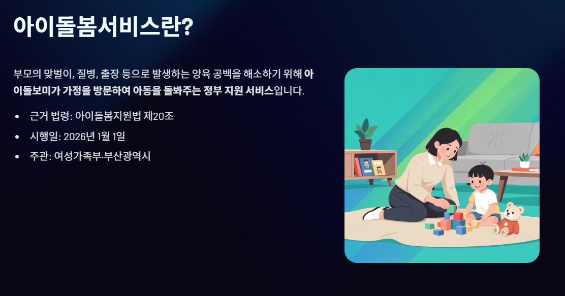 아이돌봄서비스는 부모의 맞벌이, 질병, 출장 등으로 발생하는 양육 공백을 해소하기 위해 아이돌보미가 가정을 방문하여 아동을 돌봐주는 정부 지원 서비스입니다.