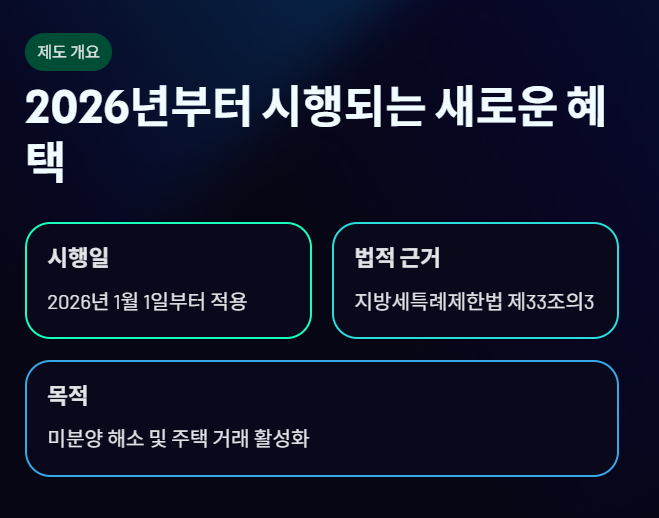 이번 개정은 지방 미분양 아파트에 대해 조례로 취득세 25% 추가 감면이 가능해짐에 따라, 주택 수요를 촉진하고 지역 내 미분양 해소 및 임대 활성화를 도모하기 위한 목적입니다.