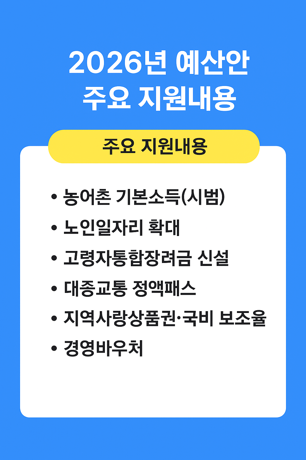 - 시범사업·신설 제도는 예산안 확정(국회 통과) 후 시행 지침이 발표됩니다. 공식 공고를 수시로 확인하세요.