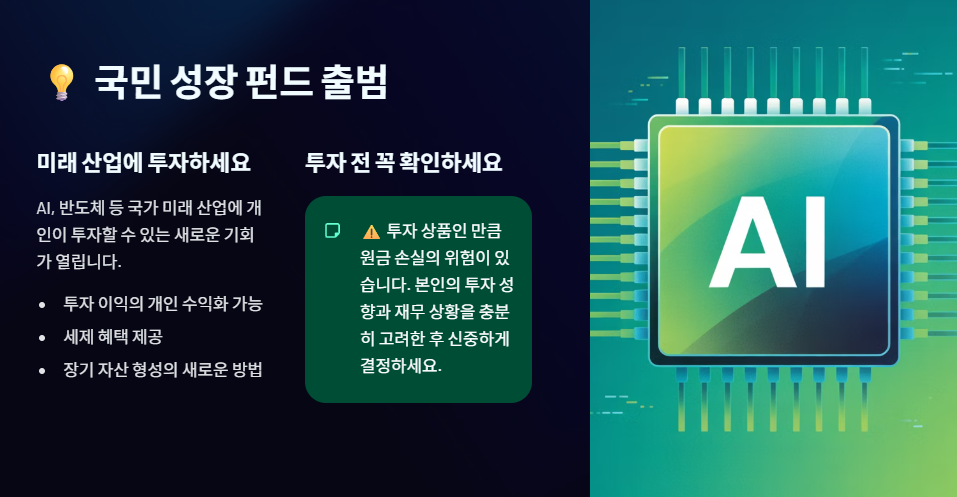 개인이 국가 미래 산업(AI, 반도체 등)에 투자할 수 있는 2026년형 투자 펀드도 마련됩니다. 투자 이익을 개인이 수익화할 수 있고 세제 혜택이 제공되지만, 투자 상품인 만큼 리스크가 존재한다는 점을 유의해야 합니다.