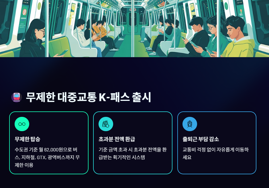 - 기준 금액: 수도권 기준 6만 2천 원이며, 버스, 지하철뿐만 아니라 GTX와 광역버스까지 적용됩니다.