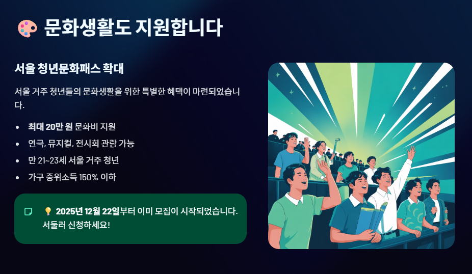 관심 있는 정책의 신청 기간을 미리 체크해 보세요! 예를 들어 서울 청년문화패스는 25년 12월 22일부터 이미 모집을 시작했습니다.