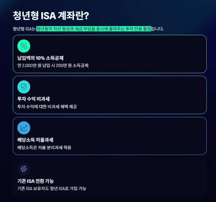 **“청년들의 자산 형성과 세금 부담을 동시에 줄여주는 투자 전용 통장”**입니다.