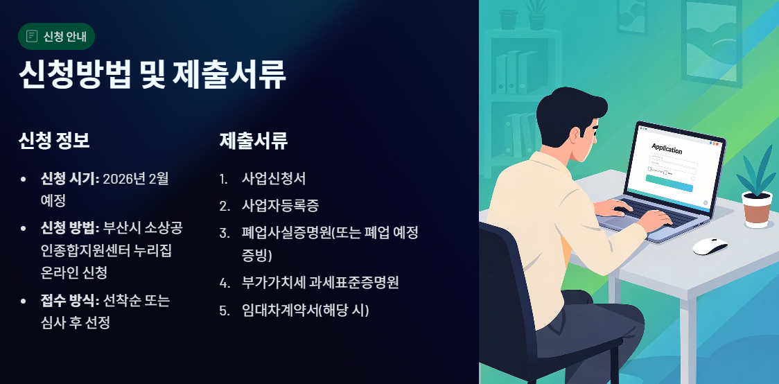 - 신청 방법: 부산시 소상공인종합지원센터 누리집 온라인 신청
