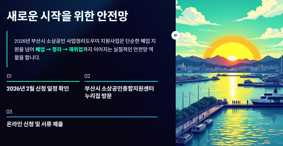 부산시는 경기 침체와 소비 위축으로 폐업을 고민하는 소상공인의 부담을 줄이기 위해 「2026년 부산시 소상공인 사업정리도우미(폐업지원사업)」을 2026년 2월부터 본격 시행할 예정입니다. 본 사업은 폐업 과정에서 발생하는 비용 부담을 완화하고, 안전한 사업 정리와 재취업까지 연계 지원하는 것이 핵심입니다. 이번 글에서는 2026년 부산시 소상공인 사업정리도우미 신청방법, 지원내용, 지원대상을 중심으로 자세히 정리해드립니다.