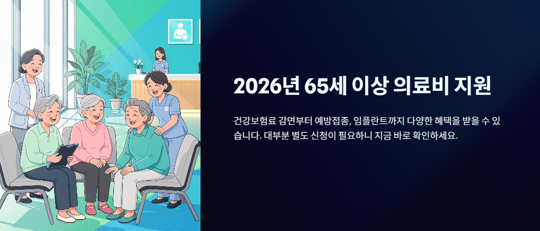 65세 이상 노인을 위한 의료비 지원은 병원비·약제비 경감, 건강검진·예방접종 지원, 임플란트·틀니 보험적용과 치매관리 서비스까지 다양합니다. 2026년 최신 정부·지자체 의료비 지원 및 신청방법을 완전 정리했습니다.