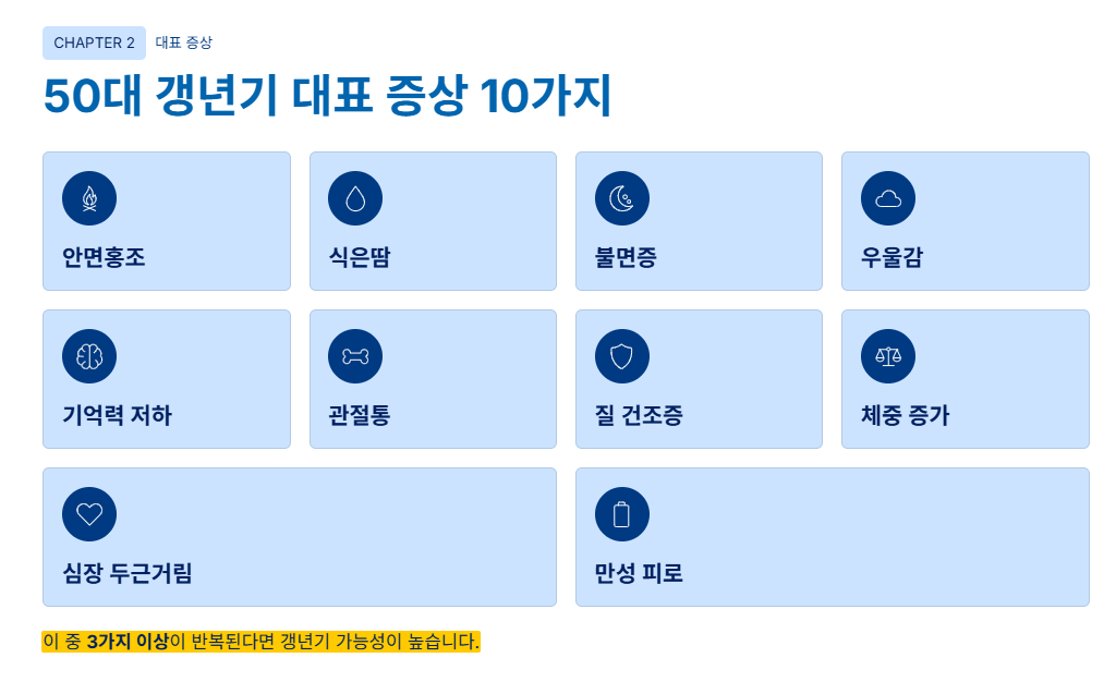 이 중 3가지 이상이 반복된다면 갱년기 가능성이 높습니다.