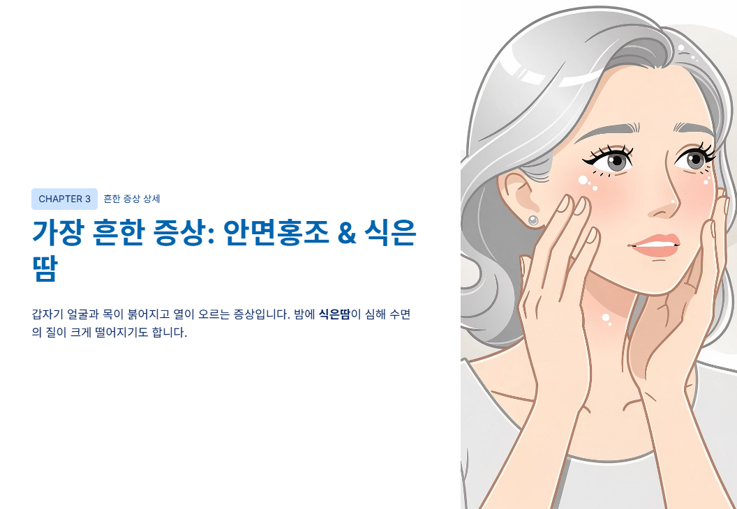 갑자기 얼굴과 목이 붉어지고 열이 오르는 증상입니다. 밤에 식은땀이 심해 수면의 질이 떨어지기도 합니다.