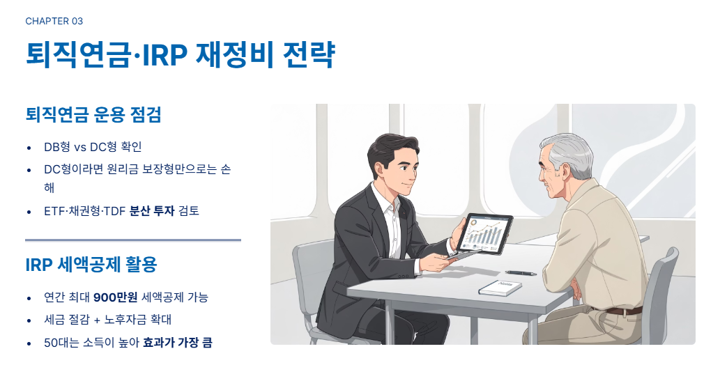 50대는 은퇴 전 마지막 준비 시기입니다. 국민연금 점검, 퇴직연금·IRP 세액공제 활용, 부채 정리, 주택연금 검토를 통해 월 현금흐름 구조를 만드는 것이 핵심 전략입니다.