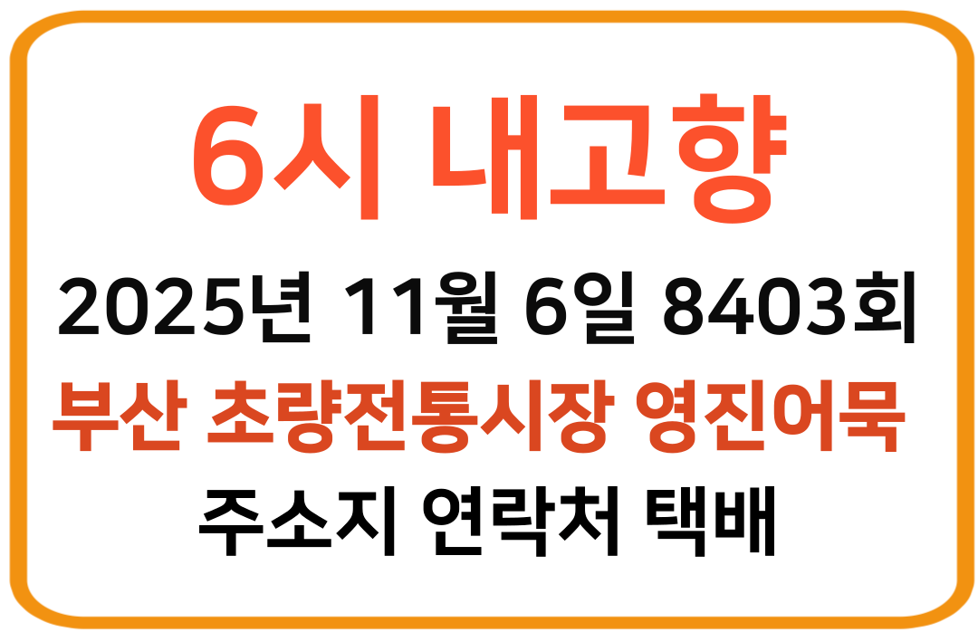 | 6시내고향 2025년 11월 6일 8403회 부산 초량전통시장 한치 칼국수 주소지 연락처 (0) | 2025.11.07 |