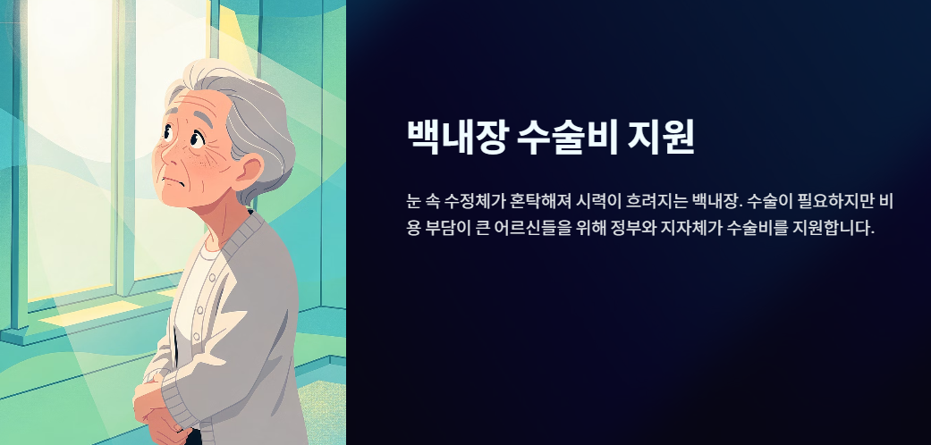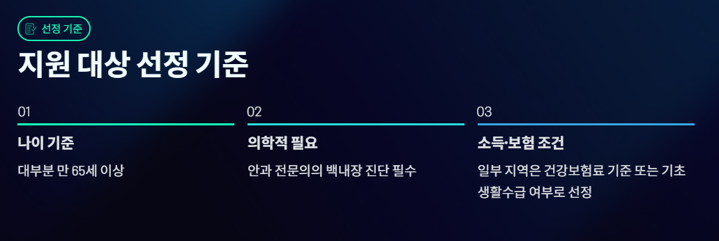 • 지원범위: 백내장 수술 본인부담금 일부 지원(지자체마다 금액 차이)