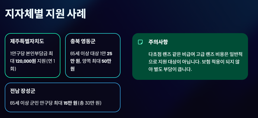 • 예) 제주특별자치도의 경우 1안구당 본인부담금 최대 120,000원 지원(연 1회)