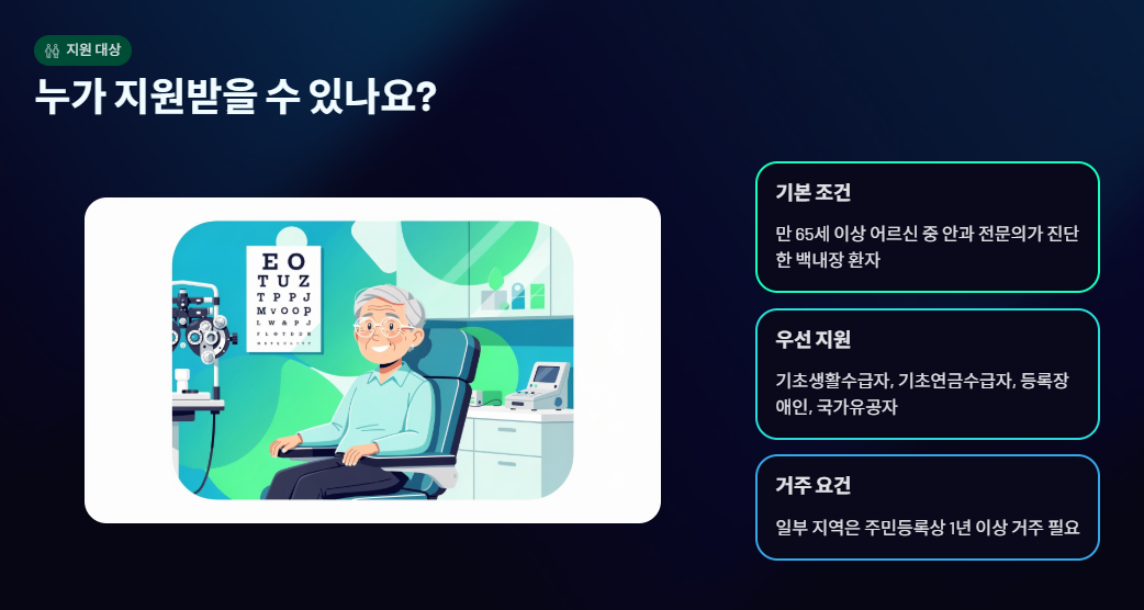 | 지원 대상 | 만 65세 이상 백내장 진단자(기초수급자·기초연금자 포함) |