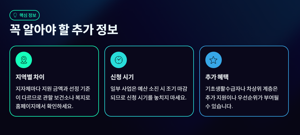 ✔ 지자체마다 지원 금액 및 선정 기준이 다르므로, 반드시 관할 보건소 또는 복지로 홈페이지에서 확인하세요.