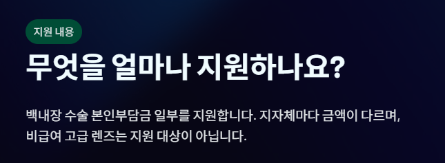 - 지원범위: 백내장 수술 본인부담금 일부 지원(지자체마다 금액 차이)