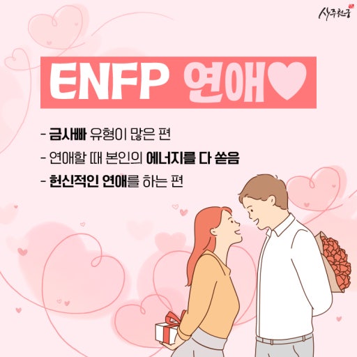 ※ ENFP는 외향(E), 직관(N), 감정(F), 인식(P) 성향이 결합된 자유롭고 창의적인 활동가형입니다. 새로운 경험과 변화를 즐기며, 다양한 가능성을 탐색합니다[1][2][5][6].