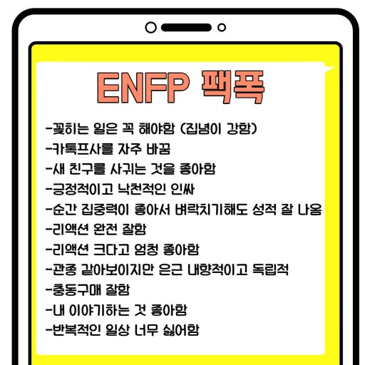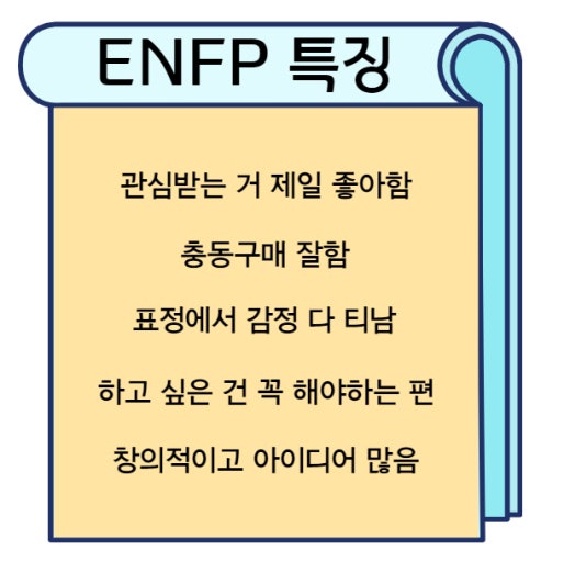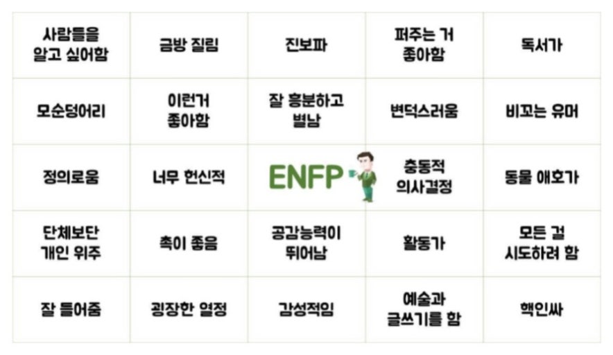 ※ ENFP는 외향(E), 직관(N), 감정(F), 인식(P) 성향이 결합된 자유롭고 창의적인 활동가형입니다. 새로운 경험과 변화를 즐기며, 다양한 가능성을 탐색합니다[1][2][5][6].