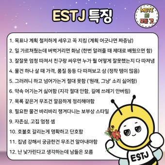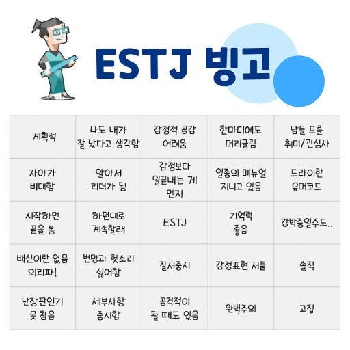 ※ ESTJ는 ‘효율적 현실주의 관리자’로서 조직력·책임감·추진력에 강점이 있지만, 감정 소통·융통성·공감·휴식은 꾸준한 노력이 필요합니다.