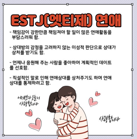 관리자, 공무원, 군인, 경영자, 회계, 조직 운영 등 체계·리더십·실용 분야에 강합니다. - Q. ESTJ 연애 스타일은?