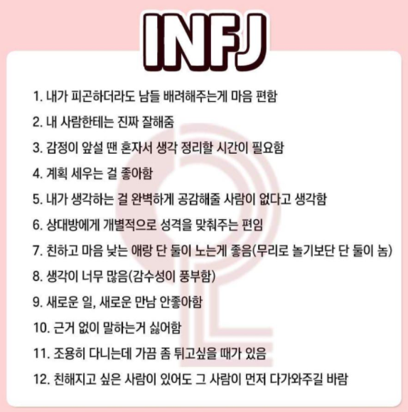 ※ INFJ는 겉으로는 공감하지만 내면에서는 비판적 사고도 강하며, 현실과 이상 사이에서 균형을 찾으려 노력합니다. 번아웃에 취약하니 자기 돌봄이 필수입니다.