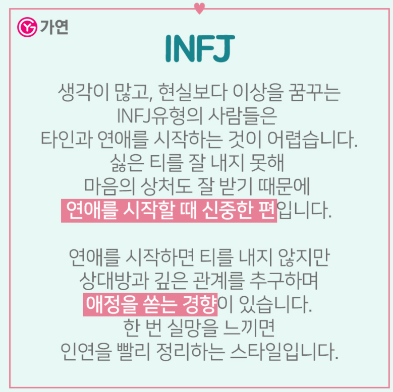 상담, 심리, 교육, 예술, 작가, 사회운동 등 의미와 가치 중심 분야에 강합니다. - Q. INFJ 연애 스타일은?