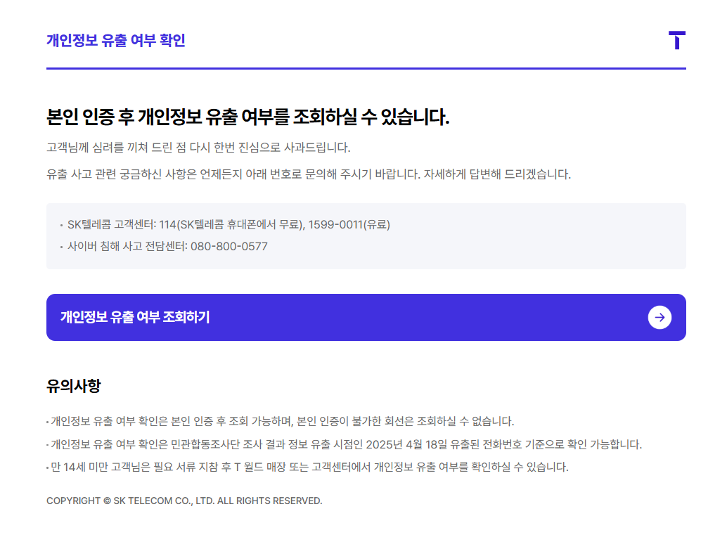 ✅ 조회는 **SK텔레콤 통신 이용자만** 가능하며, 유출 사실이 없는 고객에게도 확인 결과를 제공합니다.