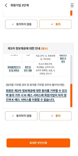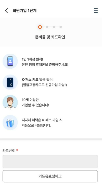 - 웹/앱에서 K-패스 홈페이지 접속 → 회원가입(본인인증) 진행.